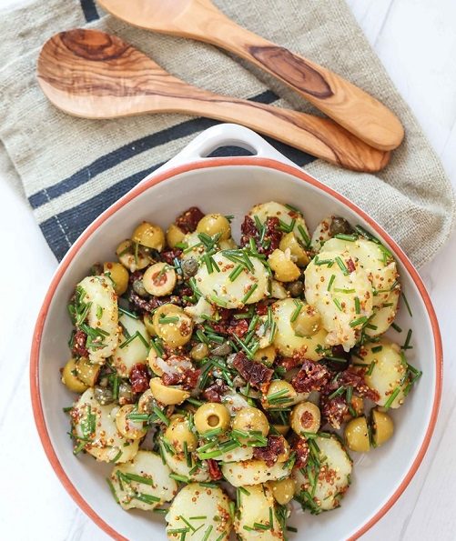 Add in the olives, sundried tomatoes, capers, and chives. Next, mix the oil for the tomatoes, mustard, and apple cider vinegar and drizzle over the salad. Season to taste with salt and pepper, mix well and serve.