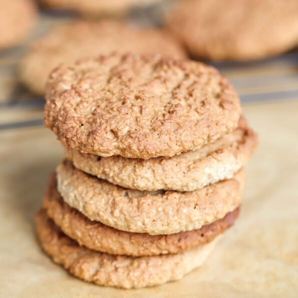 In a bowl, mix the oats, flour, almond meal, baking powder, and a pinch of salt. Add in maple syrup and coconut oil, mix well until combined.